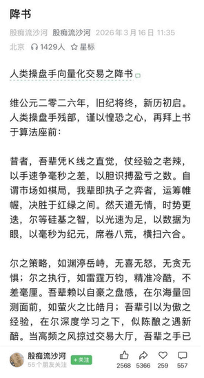 2026 年 3 月,炒股圈真的炸了!那些以前靠打板、抓牛股赚大钱的大佬 —— 流沙河、花哥、小风神、小盟主、陈小群,全都扛不住了,有的公开认输,有的直接停手不玩了,流沙河还写了篇文章,说咱们人工炒股的,干不过量化机器人,直接 “投降” 了。