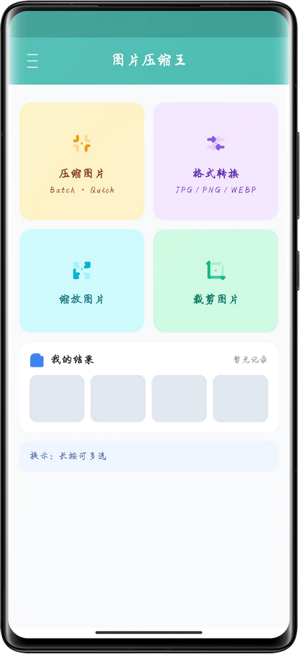 图片压缩王安卓版是一款非常实用的手机图片处理工具,集 图片压缩、格式转换、裁剪、缩放、证件照制作 等多种功能于一体。无论是日常图片处理,还是批量优化图片大小,这款软件都能轻松搞定。软件操作简单,界面清爽,支持单张或多张图片一键处理,大大提升效率。对于需要压缩图片上传、转换格式或制作证件照的用户来说,非常方便实用。