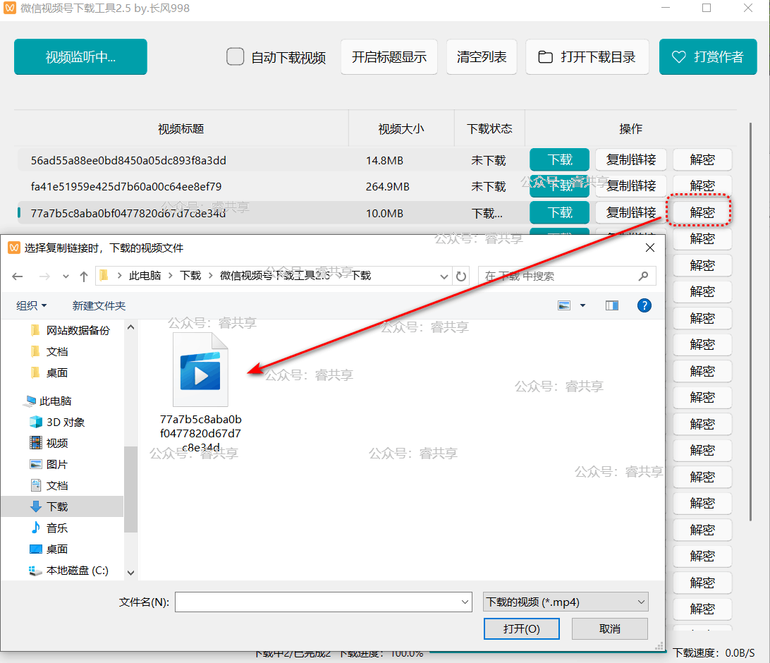 手动下载:先点“复制链接”,把链接丢到你常用的下载工具里下到本地。等下载完后,再回到软件点“解密”,选中刚下好的视频,就能正常播放了。