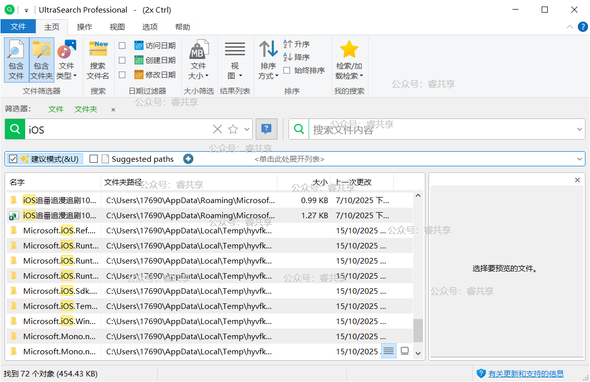 结果区域:搜索结果会以列表的形式展示,每个文件都会显示完整路径、大小、最后修改时间等信息,让你一眼就能看到想找的内容。