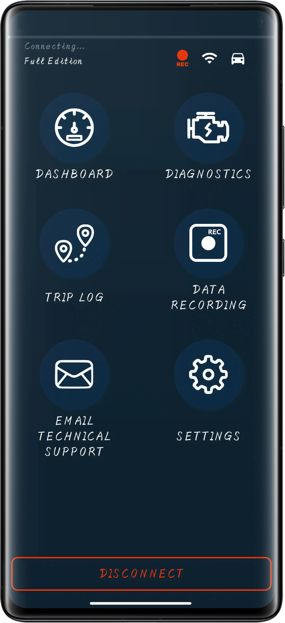在使用 Obd Mary 之前,你需要一个 ELM327 适配器。把它插入汽车的 OBD 接口后,通过蓝牙把手机和适配器连接起来。接着打开应用,点击屏幕底部的“连接”按钮。等界面上的图标亮起,就说明已经成功连接。