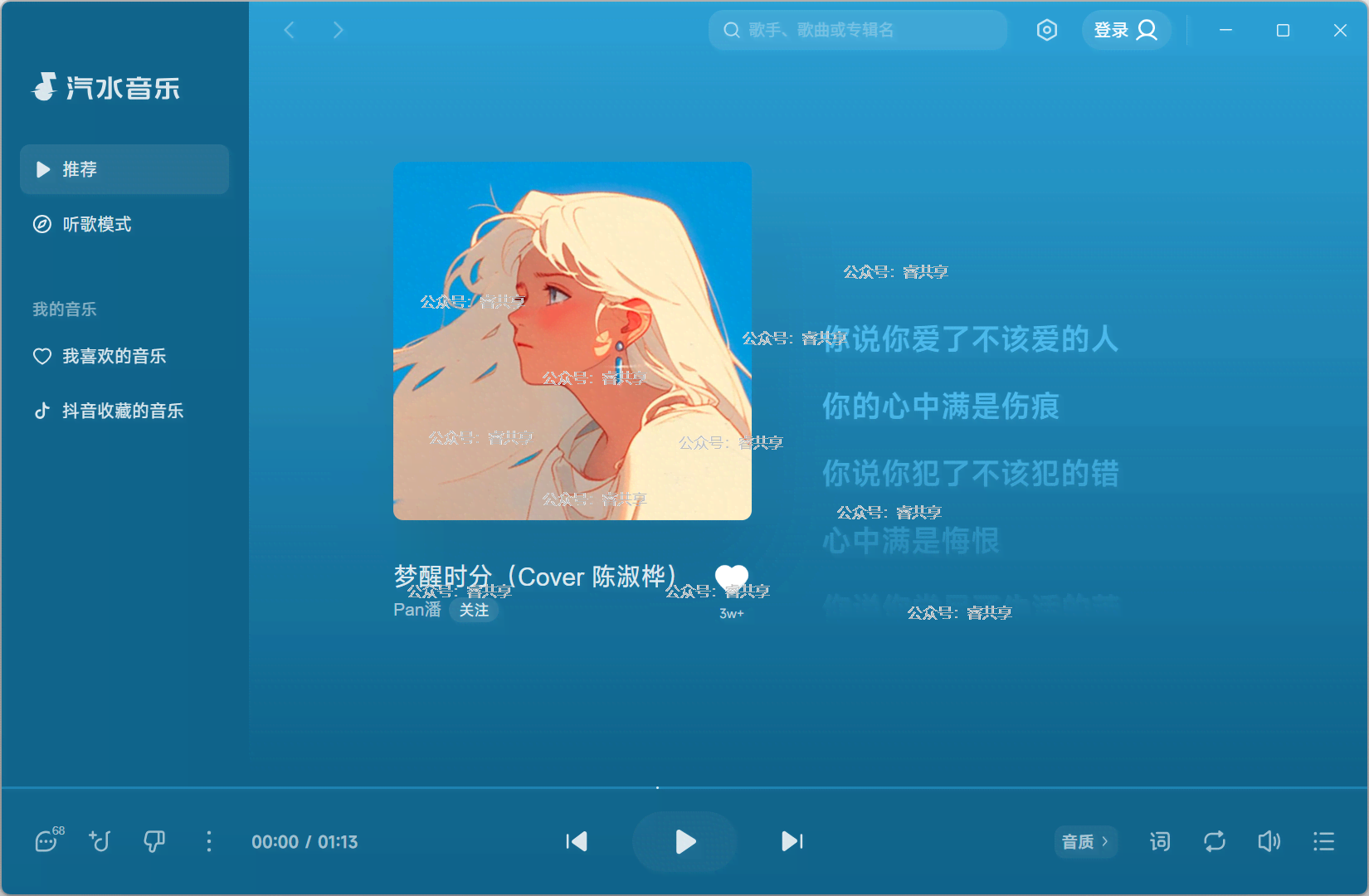 汽水音乐支持好多音频格式,像MP3、WAV、FLAC这些常见的格式都行,这样就能保证你用最好的音质来听歌。它还有个音效设置功能,你可以按照自己的喜好来调整声音效果,比如把低音调重一点,或者让声音更清晰啥的,让你在电脑上听歌的时候特别爽。