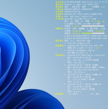 可在桌面实时显示 CPU 使用率、物理内存占用、硬盘使用情况,以及网络下载和上传速度。