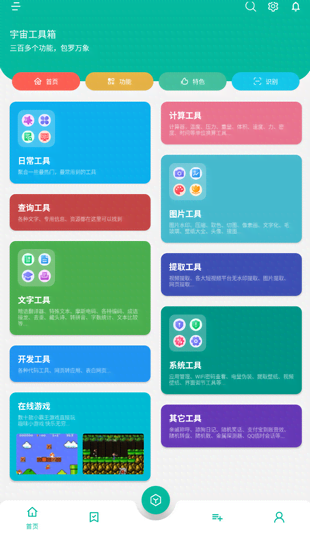 宇宙工具箱App是一款功能异常丰富的手机工具箱软件,虽然安装包体积非常小巧,但却内置了超过300种实用功能,几乎覆盖了我们日常生活中的方方面面。无论是系统操作、图片处理,还是各种信息查询,都可以在这一款软件中轻松完成。对于不想在手机里安装一堆零散工具的用户来说,宇宙工具箱无疑是一个非常省心的选择。用户无需注册或复杂设置,打开即可使用各类功能,极大提升了日常使用效率。尽管功能数量众多,但软件整体运行流畅,占用内存小,对手机性能要求低,老机型同样可以顺畅使用。